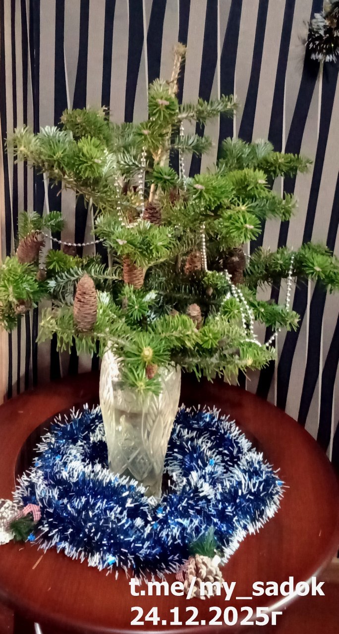 Обычно подстригаю ее крону и срезаю вытянувшиеся макушки. Искусственно сдерживаю ей рост и габариты, что бы гармонично вписывалась в общую картину насаждений. И одна макушечка сформировалась под новогоднюю красавицу. Грех было ждать до весны, что бы обрезать и выбросить. Поэтому ее к празднику деда Мороза и красавицы Снегурочки отнес в квартиру, где она дополнила своей естественностью новогодний праздничный интерьер. И еще возникла мысль попробовать за счет целенаправленной правильной подрезки заложить новую подобную зеленую убранницу. ☃️⬇️